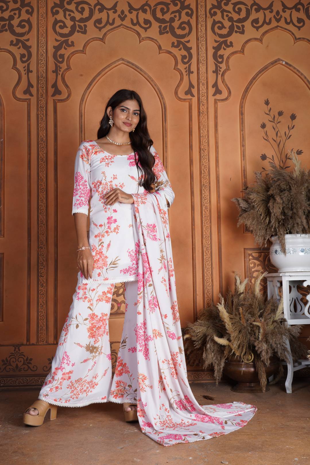 Soft, striking, and full of summer charm — the Phoolwari Sharara Set is made for long lunches, pre-wedding days, and every moment you want to feel effortlessly beautiful. Crafted in soft silk, this three-piece ensemble features a straight-cut kurta, flared sharara pants, and a fluid dupatta — all blooming with romantic floral prints in blush, coral, and muted gold.