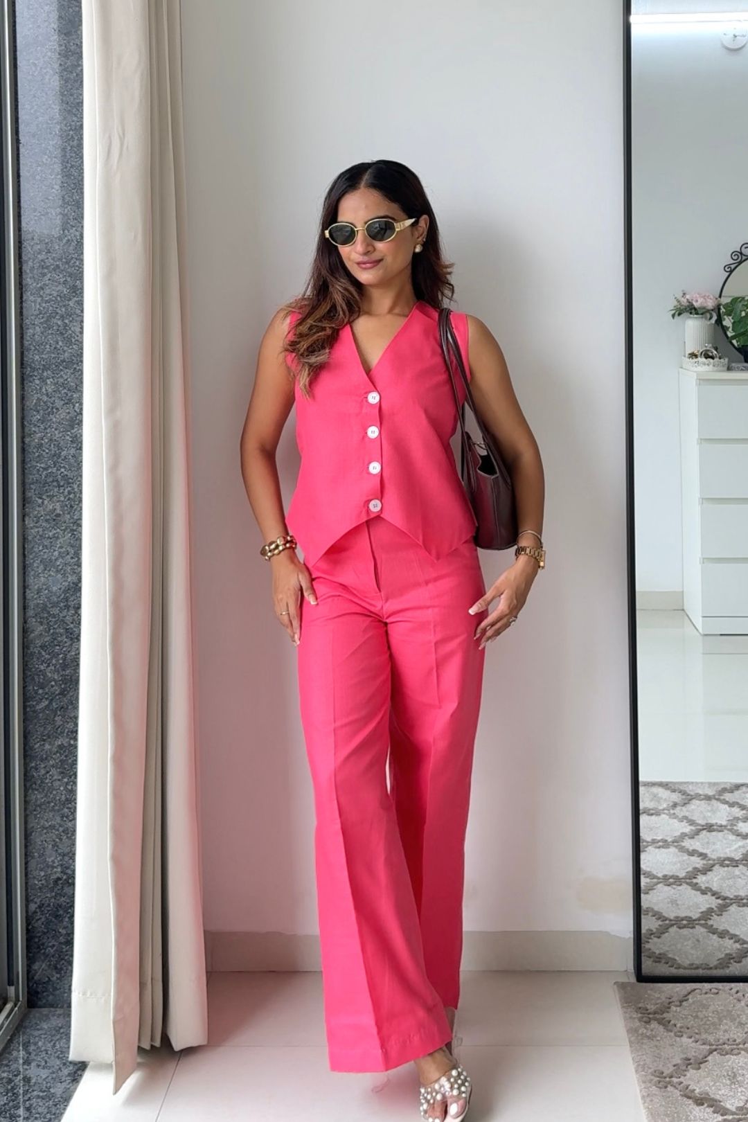 Vibrant, tailored, and unapologetically bold — the Rose Punch Co-ord Set is designed for days when you want to make a confident style statement with ease. Made from breathable magic linen, this sleeveless top features a flattering V-neckline, structured shoulders, and a unique pointed hem with shell buttons. The matching high-waisted trousers offer a sleek straight fit, perfect for transitioning from desk to dinner in minutes. Whether you're attending a power brunch or stepping out for a day in the city, this set delivers a blend of sharp tailoring and relaxed charm.
