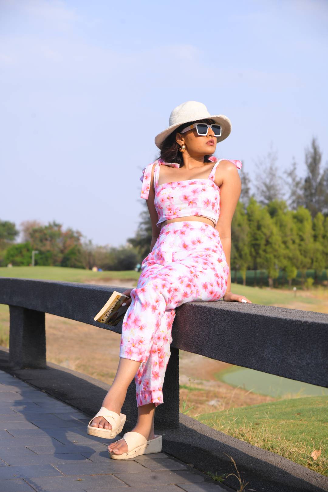 Add a pop of playful charm to your wardrobe with our Sakura Breeze Crop Top. Made from a soft cotton blend, this strappy crop top features an all-over cherry blossom print and feminine tie-up shoulder straps. The fitted silhouette hugs you in all the right places, making it perfect for pairing with high-waisted pants, skirts, or shorts. Whether you're heading for brunch or a beach day, this top brings a fresh, effortless vibe to your look.